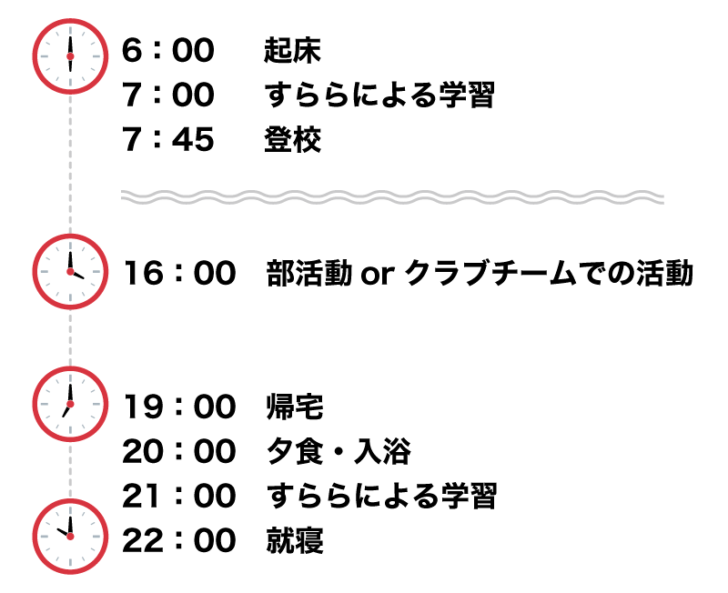 所属する部活やクラブチームの練習時間、家庭の環境などにもよるため理想的なスケジュールは人それぞれですが、ここでは1つの例を紹介いたします。このように、各自のライフスタイルに合わせて内容な順序を担任と話し合いながら構築していきます。